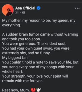 Nigerian singer-songwriter Asa has shared the heartbreaking news of her mother’s passing, revealing she died after a sudden battle with a brain tumor.