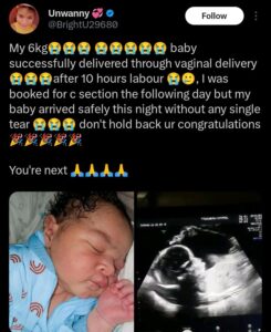 According to her account, she was already booked for a caesarean section due to medical concerns, but went into labour before the scheduled procedure. What followed, she says, was a surprising and successful natural delivery of a 6kg baby after about 10 hours of labour.
