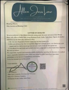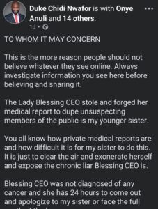In a viral Facebook post, Duke alleged that the medical report shared by Blessing CEO was not hers, but belonged to his sister, Mbara Deborah.