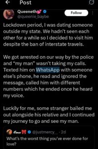 The lady, identified as @queen_babie on X (formerly Twitter), revealed that the incident happened in 2020 when interstate travel was strictly banned.
