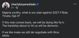 In a post shared on his official Facebook page, Charly Boy expressed concern over the country’s current economic situation, suggesting that conditions could become even more difficult if President Bola Ahmed Tinubu secures another term in office. He urged Nigerian youths to think critically about the future and not take the upcoming elections lightly.