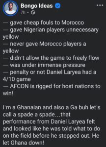 A Ghanaian social media commentator, Bongo Ideas, has sparked fresh debate after criticising the referee who officiated the tense match between Nigeria and host nation Morocco.
