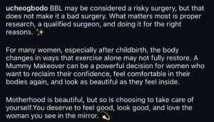 “Yes, BBL is risky, but which surgery isn’t? People die from fibroid surgeries, C-sections, and even complications related to headaches.”