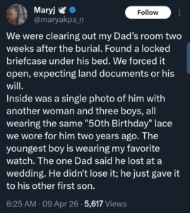 According to a social media post by the daughter, the family was sorting through their father’s belongings when they stumbled upon a locked briefcase hidden under his bed. Expecting documents such as land papers or a will, they decided to open it—but what they found was far more personal.