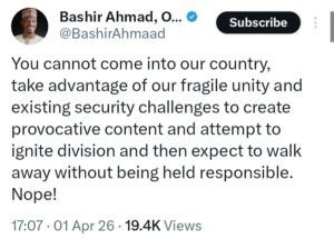 “A reliable source has informed me that the hate monger, Mr. Alex Barbir, has been ordered by the authorities to leave this country. Since arriving in Nigeria, he has been attempting to ignite religious tensions, particularly in communities he visited across the North Central region. Our nation’s peace and unity must never be compromised, and anyone found promoting division should be held accountable. You cannot come into our country, take advantage of our fragile unity and existing security challenges to create provocative content and attempt to ignite division and then expect to walk away without being held responsible. Nope!”
