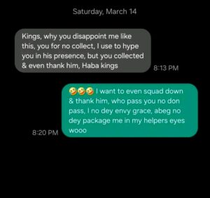 Hassan responded humorously, saying: “I even want to sit down and thank him. I don’t envy Grace, please don’t package me in my helpers’ eyes.”