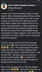 The man, identified on Facebook as Comr Ishaku Kingsley Hassan, recounted that he had a brief conversation with the couple before his upcoming wedding. To his surprise, the husband offered him $300 in support, saying it was a gesture for his marriage.