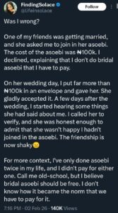 Taking to X (formerly Twitter), she recounted how her decision not to buy the asoebi later strained her friendship with the bride, despite the financial support she offered.
