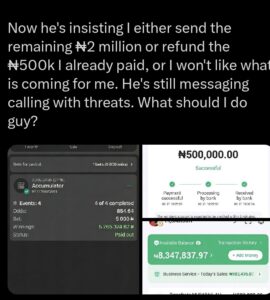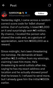 “He demands at least another ₦2.5 million from my winnings, claiming I owe him more. He’s threatening to send cultists after me, saying he has my exact address and location, and he actually showed proof that he knows it. I refused to send more, but I already gave him the initial ₦500k earlier,” he wrote.
