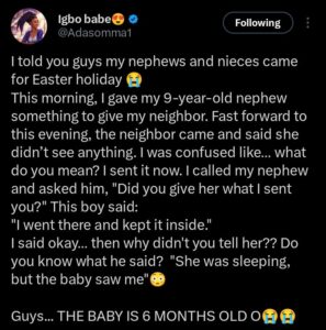 A woman has left social media users laughing after sharing a hilarious moment involving her 9-year-old nephew during an Easter visit.