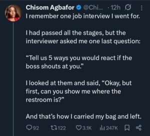 A lady’s account of a job interview experience has sparked wide debate on X, formerly Twitter, after she described walking out over a controversial final question.