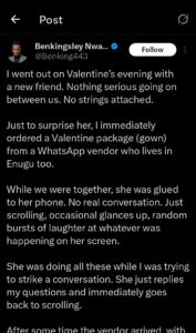 According to him, he had ordered a Valentine’s Day package from a vendor based in Enugu while spending time with the lady.