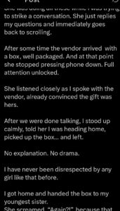 “After some time, the vendor arrived with a box, well packaged. At that point, she stopped pressing her phone. Full attention unlocked. She listened closely as I spoke with the vendor, already convinced the gift was hers. After we were done talking, I stood up calmly, told her I was heading home, picked up the box and left.”