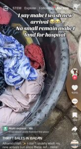 A TikTok user has shared a shocking encounter that has left social media buzzing. The lady, known as @Thriftbalesinibadan, recounted how a routine washing of second-hand clothes—popularly called ‘okrika’—almost ended in disaster.