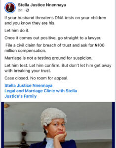 In her post, the lawyer stated that women should demand heavy compensation once the DNA test comes back positive, describing such suspicion as damaging to marriage.