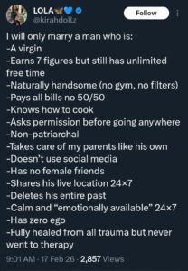 The post, shared on X, quickly went viral, with many users questioning whether her standards were serious or intended as satire.