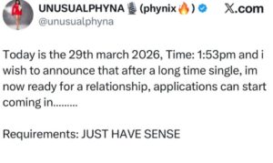 “Today is the 29th of March 2026, Time: 1:53pm, and I wish to announce that after a long time single, I’m now ready for a relationship. Applications can start coming in… Requirements: JUST HAVE SENSE.”