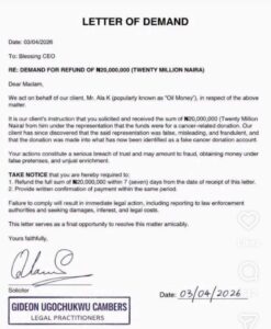 Through his legal representatives, Oilmoney formally requested the return of the ₦20 million reportedly given for medical support.