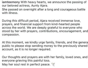 Aunt Ajara’s passing comes weeks after a distressing video of her in critical condition—lying on a hospital bed and receiving oxygen—went viral online.