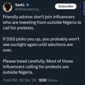 In a viral statement, Sarki cautioned that Nigerians who join such demonstrations risk being detained by security agencies, particularly the Department of State Services (DSS). He advised people to be mindful, stressing that many of those calling for protests are not physically present in Nigeria and may not face the same consequences.