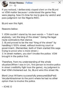 A Nigerian man has stirred conversations after openly declaring BLord the “true king of the street,” arguing that VeryDarkMan lost credibility by taking the dispute to law enforcement.