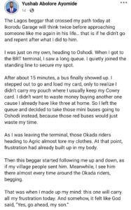 Ayomide had initially planned to board a BRT bus but left the queue after realizing he had forgotten his wallet. Opting for a mini-bus instead, he soon noticed a beggar following him relentlessly, asking for money to cover transport costs.