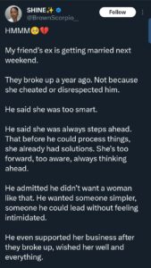According to the post, the couple called it quits about a year ago. The man reportedly admitted that he felt intimidated by his partner’s sharp mind and forward-thinking nature. She was described as “too smart,” always anticipating problems and coming up with solutions before he even had a chance to process the situation.