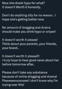 “No amount of dragging and drama should make you drink hypo or sniper! It doesn’t worth it please!” she stated.