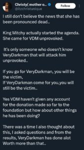 In her post, she claimed that King Mitchy initiated the conflict by confronting VeryDarkMan.