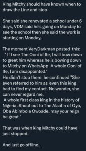 She also referenced remarks allegedly made by VeryDarkMan about the Ooni of Ife, in which he expressed disappointment over the way the monarch was addressed. In the same breath, she noted that he had given a shout-out to the Alaafin of Oyo.