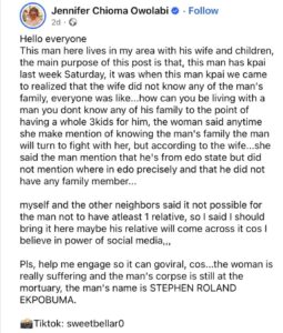 “This man passed away last Saturday. It was then we realised the wife did not know any of his family. Everyone was asking, how can someone live with a man for years, have three kids, and not know a single relative? She tried asking before, but he would get angry. All she knew was that he said he was from Edo State. We believe in the power of social media. Maybe his family will see this and come forward. The woman is really suffering, and his body is still at the mortuary.”