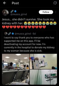 “Jesus, she didn’t survive. She took my kidney with her. 😭💔,” he posted, expressing his deep grief.