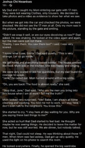 When they entered the house, everything appeared normal. His mother was in the kitchen preparing food and seemed unaware that anything unusual had happened.