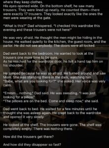 Moments later, he returned to check the wardrobe again. To his disbelief, the trousers had completely disappeared. The shelf was empty, leaving both father and son deeply confused about what they had experienced.
