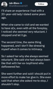 A Nigerian man has shared a past relationship experience on social media, sparking renewed conversations about consent and personal boundaries in modern dating.