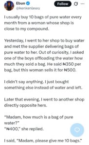 “I usually buy 10 bags of pure water every month from a woman whose shop is close to my compound. Yesterday, I went to her shop to buy water and met the supplier delivering bags. Out of curiosity, I asked one of the boys offloading the water how much they sold a bag. He said ₦350, but this woman sells it for ₦500.