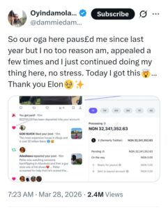 A Nigerian content creator on X has gone viral after celebrating a whopping ₦32 million payout from the platform, despite previous account restrictions. The user, @dammiedammie35, shared their excitement after receiving the funds, revealing that their account had been paused last year.