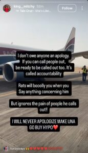 In a strongly worded post shared online, Mitchy defended her position, arguing that anyone who publicly calls others out should also be prepared to face criticism in return. She described her actions as a matter of accountability and accused supporters of her rival of attacking her while overlooking the concerns of those he criticizes.